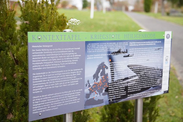 Die Gedenktafel an der Friedhofskapelle ist ein Ort des Gedenkens für Angehörige. Sie ist auch ein wichtiges historisches Zeugnis, das uns Einblicke in unsere Geschichte gibt und der Mahnung dient. Diese Kontexttafel dient der Aufarbeitung und Einordnung in den Zusammenhang der Zeit des Nationalsozialismus in Deutschland. Sie soll aufzeigen, dass es mehr Opfer gibt als auf der Gedenktafel dargestellt sind und das die Frage nach Tätern und Opfern sehr komplex ist.