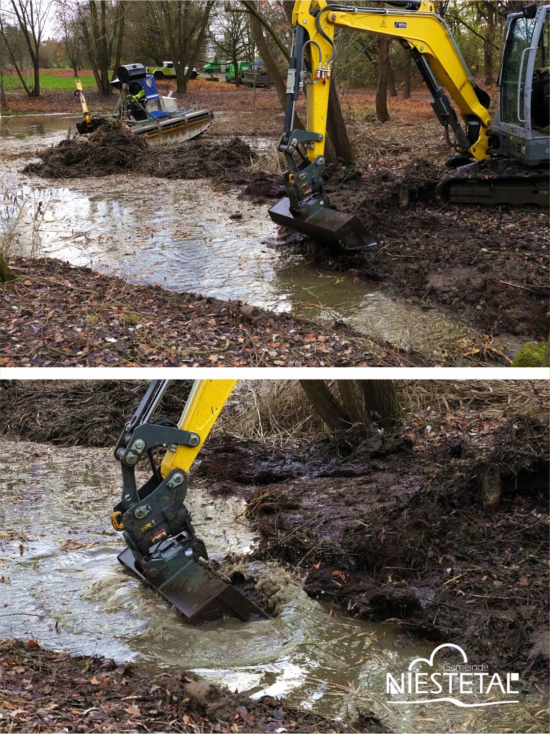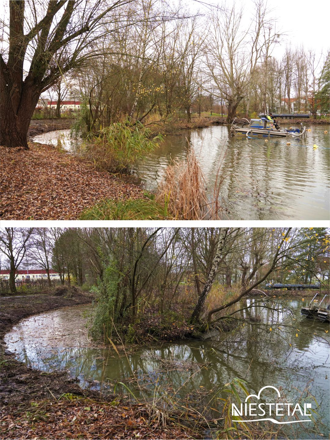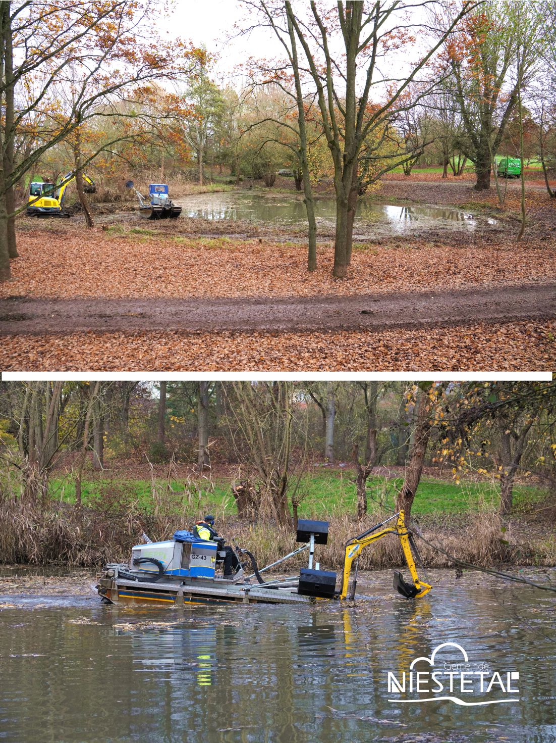 Bei den oberen Teichen wurde diesen November nun der Wasserstand leicht abgesenkt, das Schilf im Teich geschnitten, die Gehölze am Ufersaum zurückgenommen und hunderte Baggerschaufeln an schlammigen Ablagerungen entnommen. Die durch die Arbeiten in Mitleidenschaft gezogenen Wege werden in Kürze wieder zu Begehung hergerichtet. Eine endgültige Beseitigung der Schlammpfade und Wiesenfurchen, die Entsorgung des angefallenen Teichschlammes und die Sanierung der Wege erfolgen im Frühjahr. Dann wird auch das Schilf im Ufersaum wieder Grün ansetzen und aussprießen. Außerdem mussten keine Tiere umgesetzt oder unnötigem Stress ausgesetzt werden, da die Arbeiten minimalinvasiv für die Tierwelt durchgeführt wurden.